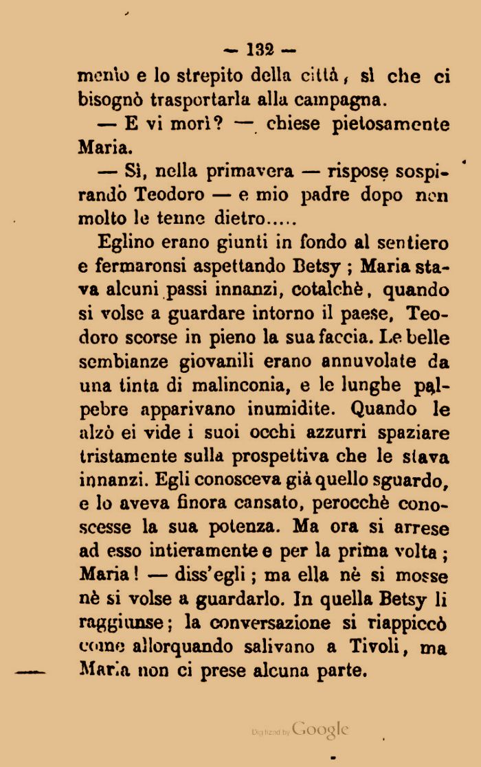 Eglino erano giunti in fondo al sentiero e fermaronsi aspettando Betsy ; Maria stava alcuni passi innanzi, cotalchè, quando si volse a guardare intorno il paese, Teodoro scorse in pieno la sua faccia. Le belle sembianze giovanili erano annuvolate da una tinta di malinconia, e le lunghe palpebre apparivano inumidite. Quando le alzò ei vide i suoi occhi azzurri spaziare tristamente sulla prospettiva che le stava innanzi. Egli conosceva già quello sguardo, e lo aveva finora cansato, perocché conoscesse la sua potenza. Ma ora si arrese ad esso intieramente e per la prima volta ; Maria! — diss'egli ; ma ella nè si mosse nè si volse a guardarlo. In quella Betsy li raggiunse ; la conversazione si riappiccò come allorquando salivano a Tivoli, ma Maria non ci prese alcuna parte.