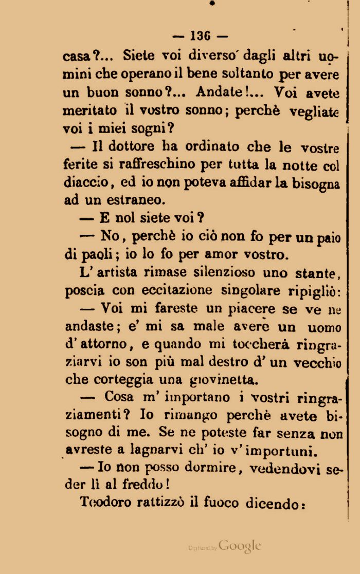 casa?... Siete voi diverso dagli altri uomini che operano il bene soltanto per avere un buon sonno?... Andate!... Voi avete meritato il vostro sonno ; perchè vegliate voi i miei sogni? — Il dottore ha ordinato che le vostre ferite si raffreschino per tutta la notte col diaccio, ed io non poteva affidar la bisogna ad un estraneo.
