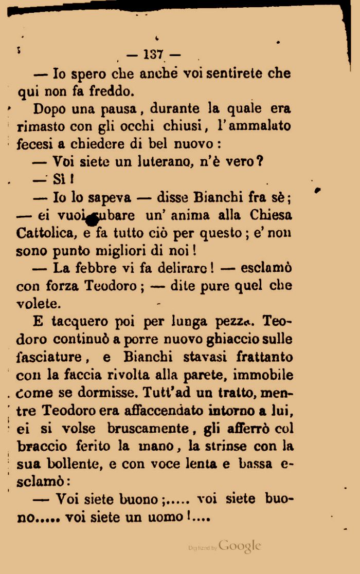 — Io lo sapeva — disse Bianchi fra sè ; — ei vuoifubare un' anima alla Chiesa Cattolica, e fa tutto ciò per questo ; e' non sono punto migliori di noi !
