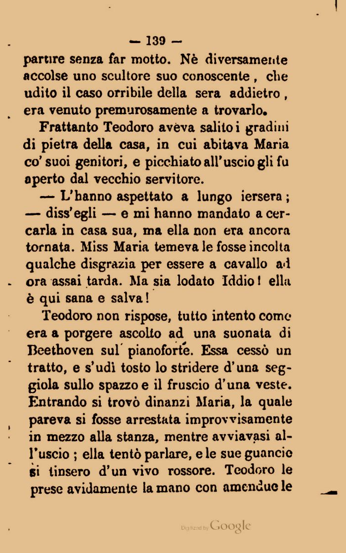 Teodoro non rispose, tutto intento come era a porgere ascolto ad una suonata di Beethoven sul pianoforte. Essa cessò un tratto, e s'udì tosto lo stridere d'una seggiola sullo spazzo e il fruscio d'una veste. Entrando si trovò dinanzi Maria, la quale pareva si fosse arrestata improvvisamente in mezzo alla stanza, mentre awiavasi all'uscio ; ella tentò parlare, e le sue guancio si tinsero d'un vivo rossore. Teodoro le prese avidamente la mano con amenduo le