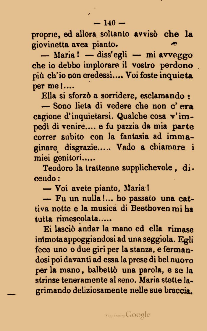 Ei lasciò andar la mano ed ella rimase intmotaappoggiandosiad una seggiola. Egli fece uno o due giri per la stanza, e fermandosi poi davanti ad essa la prese di bel nuovo per la mano, balbettò una parola, e se la strinse teneramente al seno. Maria stette la-grimando deliziosamente nelle sue braccia.