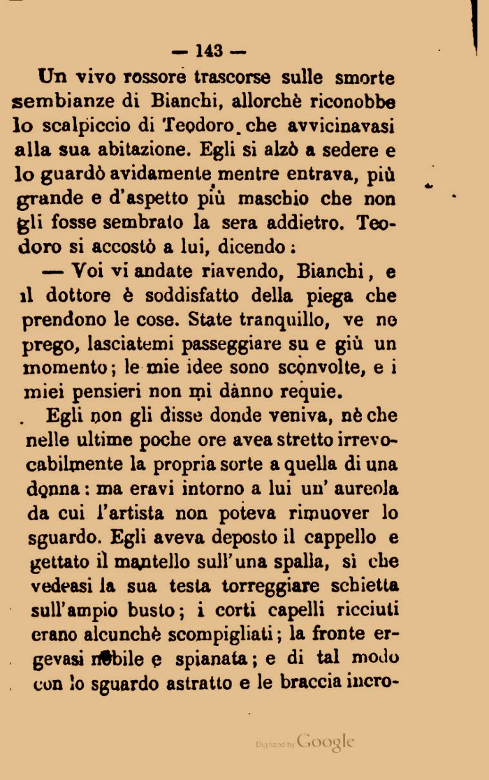 Un vivo rossore trascorse sulle smorte sembianze di Bianchi, allorché riconobbe lo scalpiccio di Teodoro, che avvicinavasi alla sua abitazione. Egli si alzò a sedere e