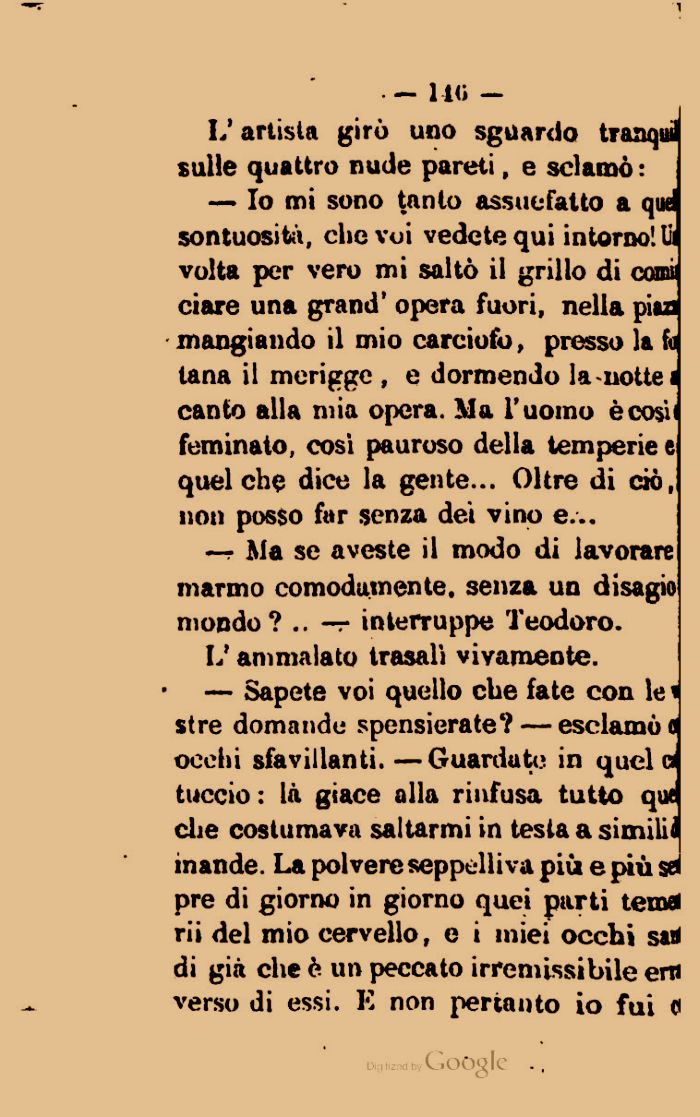 — Io mi sono tanto assuefatto a quei sontuosità, che voi vedete qui intorno'. li volta per vero mi saltò il grillo di comi ciare una grand' opera fuori, nella più mangiando il mio carciofo, presso la fo tana il merigge, e dormendo la nottei canto alla mia opera. Ma l'uomo ècosii feminato, cosi pauroso della temperie e quel che dico la gente... Oltre di ciò, non posso far senza dei vino e...