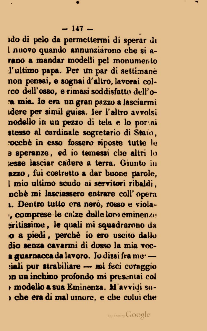 ido di pelo da permettermi di sperar di 1 nuovo quando annunziarono che si a-rano a mandar modelli pel monumento l'ultimo papa. Per un par di settimane non pensai, e sognai d'altro, lavorai col-rco dell'osso, e rimasi soddisfatto dell'oca mia. lo era un gran pazzo a lasciarmi idere per simil guisa. Ier l'altro avvolsi nodello in un pezzo di tela e lo pomi stesso al cardinale segretario di Staio, •occhè in esso fossero riposte tutte le ì speranze, ed io temessi clic altri lo lesse lasciar cadere a terra. Giunto in azzo , fui costretto a dar buone parole, I mio ultimo scudo ai servitori ribaldi, ncbè mi lasciassero entrare coli' opera i. Dentro tutto era nero, rosso e viola-i, comprese le calze dello loro eminenze tritissime, le quali mi squadrarono da o a piedi, perchè io ero uscito dallo dio senza cavarmi di dosso la mia vec-aguarnacca da lavoro. Io dissi fra me- — siali pur strabiliare — mi feci coraggio >n un inchino profondo mi presentai col
