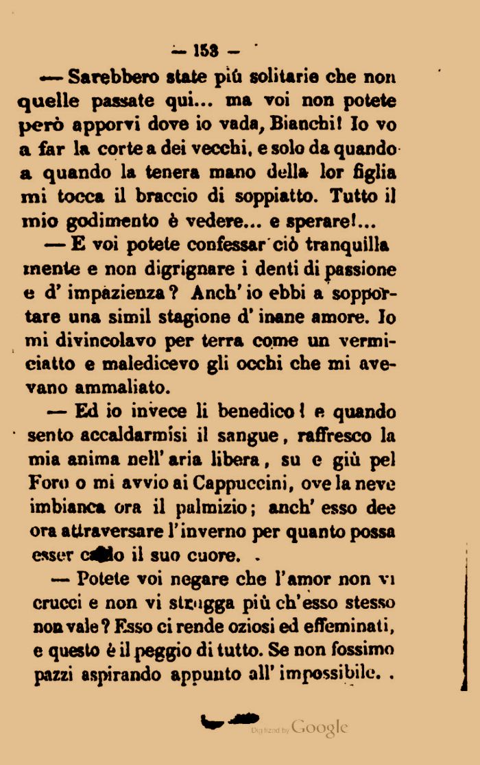 — Sarebbero state più solitarie che non quelle passate qui... ma voi non potete però apporvi dove io vada. Bianchi! Io vo a far la corte a dei vecchi, e solo da quando a quando la tenera mano della lor figlia mi tocca il braccio di soppiatto. Tutto il mio godimento è vedere... e sperare!...