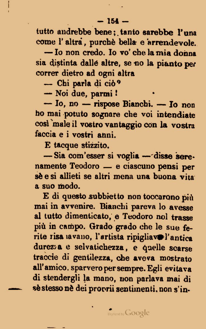 E di questo subbietto non toccarono più mai in avvenire. Bianchi pareva lo avesse al tutto dimenticato, e Teodoro noi trasse più in campo. Grado grado che le sue ferite risa lavano, l'artista ripigliav®l'antica durezza e selvatichezza, e quelle scarse traccle di gentilezza, che aveva mostrato all'amico, sparveropersempre.Egli evitava di stendergli la mano, non parlava mai di sè stesso nè dei proprii sentimenti, non s in-