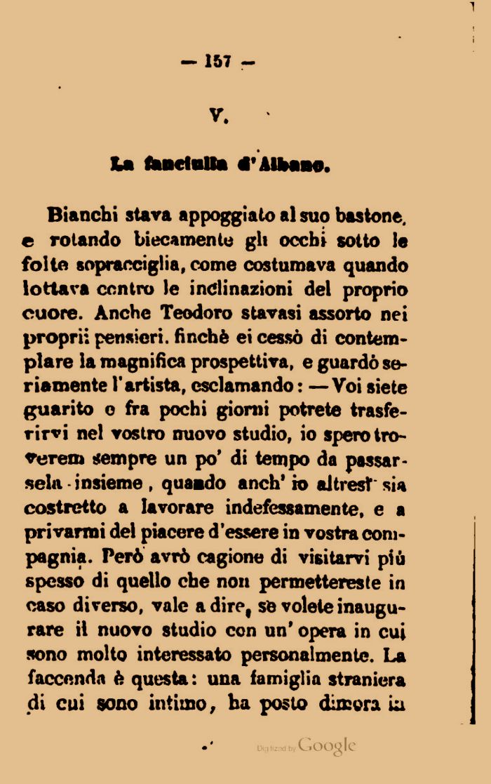 Bianchi stava appoggiato al suo bastone, e rotando biecamente gli occhi sotto le folto sopracciglia, come costumava quando lottava centro le inclinazioni del proprio cuore. Anche Teodoro stavasi assorto nei propri: pensieri, finché ei cessò di contemplare la magnifica prospettiva, e guardò seriamente l'artista, esclamando : —Voi siete guarito o fra pochi giomi potrete trasferirvi nel vostro nuovo studio, io sperotro-verem sempre un po' di tempo da passarsela insieme , quaado anch' io altresf sia costretto a lavorare indefessamente, e a privarmi del piacere d'essere in vostra compagnia. Però avrò cagione di visitarvi più spesso di quello che non permettereste in caso diverso, vale adire, se volete inaugurare il nuovo studio con un' opera in cui sono molto interessato personalmente. La faccenda è questa : una famiglia straniera di cui sono intimo, ha posto dimura ia