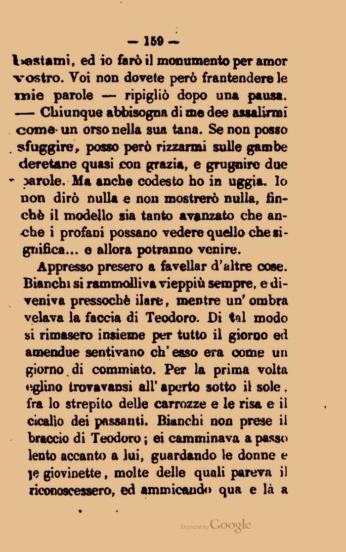 Appresso presero a favellar d'altre cose. Bianchi si rammolliva vieppiù sempre, e diveniva pressoché ilare, mentre un' ombra velava la faccia di Teodoro. Di tal modo si rimasero insieme per tutto il giorno ed amendue sentivano ch'esso era come un giorno di commiato. Per la prima volta eglino trovavansi all' aperto sotto il sole . fra lo strepito delle carrozze e le risa e il cicalio dei passanti. Bianchi non prese il braccio di Teodoro ; ei camminava a passo lento accanto a lui, guardando le donne e je giovinette, molte delle quali pareva il riconoscessero, ed ammicando qua e là a