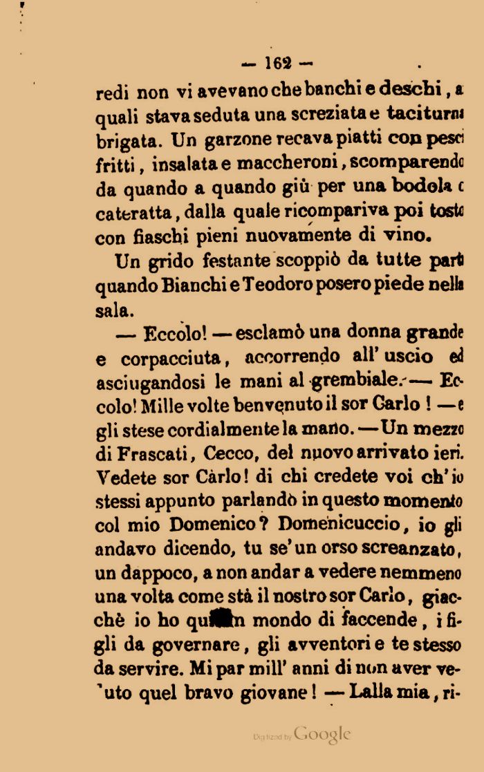 redi non vi avevano chebanchi e deschi, a quali stava seduta una screziata e taciturni brigata. Un garzone recava piatti eoa pesci fritti, insalata e maccheroni, scomparendc da quando a quando giù per una bodola c cateratta, dalla quale ricompariva poi toste con fiaschi pieni nuovamente di vino.