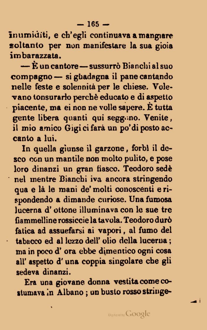 In quella giunse il garzone, forbì il desco con un mantile non molto pulito, e pose loro dinanzi un gran tiasco. Teodoro sedè nel mentre Bianchi iva ancora stringendo qua e là le mani de' molti conoscenti e rispondendo a dimande curiose. Una fumosa lucerna d' ottone illuminava con le sue tre fiammelline rossiccie la tavola. Teodoro durò fatica ad assuefarsi ai vapori, al fumo del tabacco ed al lezzo dell' olio della lucerna ; ma in poco d' ora ebbe dimentico ogni cosa all' aspetto d' una coppia singolare che gli sedeva dinanzi.