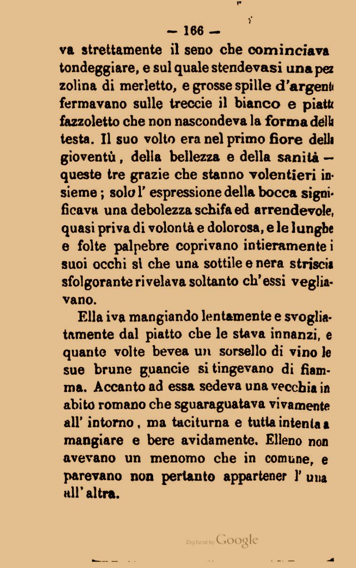 Ella iva mangiando lentamente e svogliatamente dal piatto che le stava innanzi, e quanto volte bevea un sorsello di vino le sue brune guancie si tingevano di fiamma. Accanto ad essa sedeva una vecchia in abito romano che sguaraguatava vivamente all' intorno, ma taciturna e tutta intenta a mangiare e bere avidamente. Elleno non avevano un menomo che in comune, e parevano non pertanto appartener 1' una all'altra.