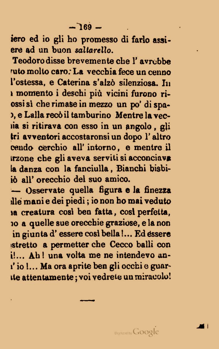 iero ed io gli ho promesso di farlo assi-ere ad un buon sallarello. Teodorodisse brevemente che 1' avrebbe ruto molto caro; La vecchia fece un cenno l'ostessa, e Caterina s'alzò silenziosa. In l momento i deschi più vicini furono riossisi che rimase in mezzo un po' di spa->, e Lalla recò il tamburino Mentre la vec-lia si ritirava con esso in un angolo, gU tri avventori accostaronsi un dopo l'altro cendo cerchio all' intorno, e mentre il irzone che gli aveva serviti si acconciava la danza con la fanciulla, Bianchi bisbi-iò all' orecchio del suo amico. — Osservate quella figura e la finezza illé mani e dei piedi ; io non ho mai veduto ia creatura così ben fatta, cosi perfetta, io a quelle sue orecchie graziose, e la non in giunta d'essere così bella!... Ed èssere istretto a permetter che Cecco balli con t!... Ah ! una volta me ne intendevo an-l'io 1... Ma ora aprite ben gli occhi e guarite attentamente ; voi vedrete uu miracolo!