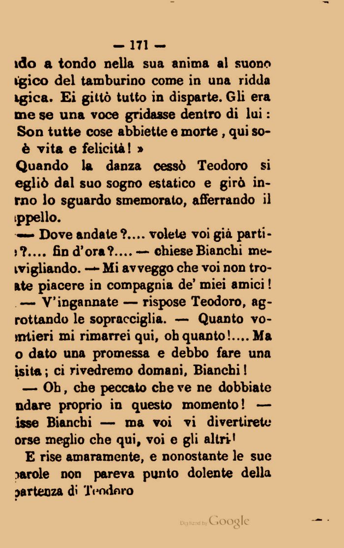 — Oh, che peccato che ve ne dobbiate ndare proprio in questo momento! — isse Bianchi — ma voi vi divertirete orse meglio che qui, voi e gli altri1