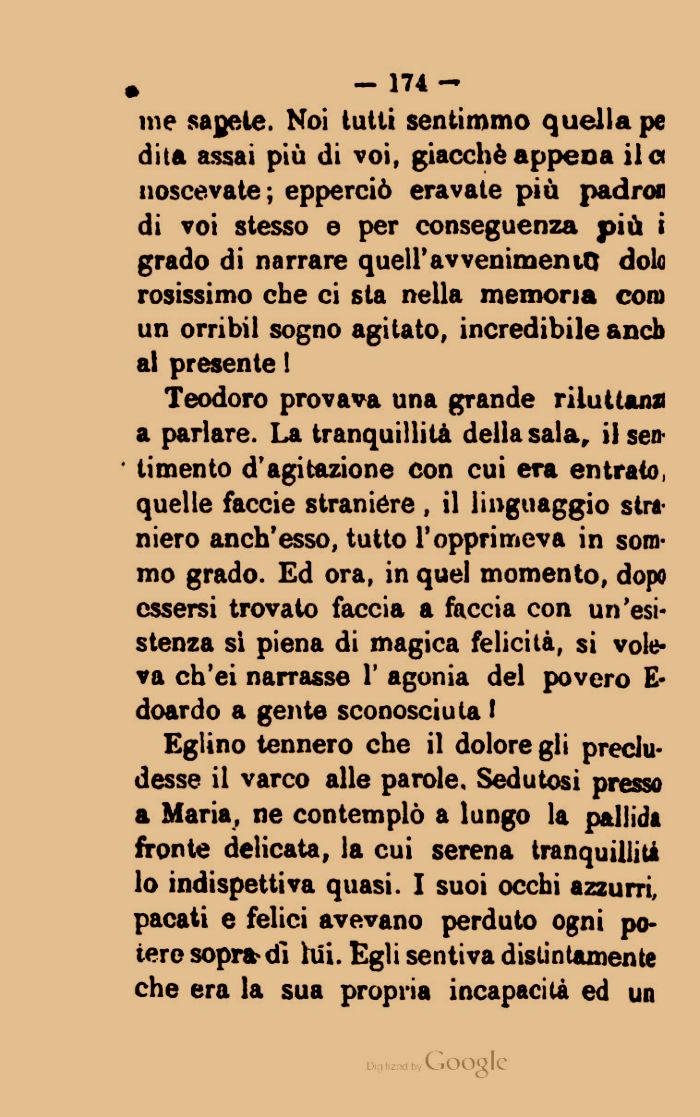 Teodoro provava una grande riluttami a parlare. La tranquillità della sala, il sen timento d'agitazione con cui era entrato, quelle faccie stranière , il linguaggio straniero anch'esso, tutto l'opprimeva in sommo grado. Ed ora, in quel momento, dopo essersi trovato faccia a faccia con un'esistenza si piena di magica felicità, si voleva ch'ei narrasse 1' agonia del povero E-doardo a gente sconosciuta I