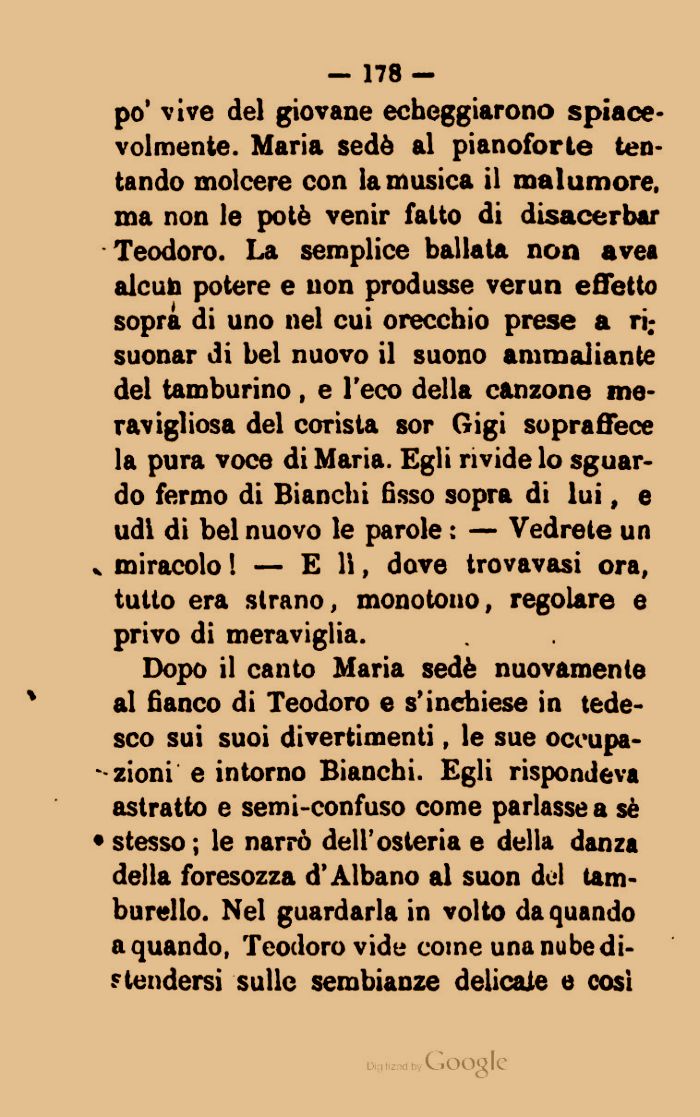 Dopo il canto Maria sedè nuovamente al fianco di Teodoro e s'inchiese in tedesco sui suoi divertimenti, le sue occupazioni e intorno Bianchi. Egli rispondeva astratto e semi-confuso come parlasse a sè • stesso ; le narrò dell'osteria e della danza della foresozza d'Albano al suon del tamburello. Nel guardarla in volto da quando a quando, Teodoro vide come una nube distendersi sulle sembianze delicate e così
