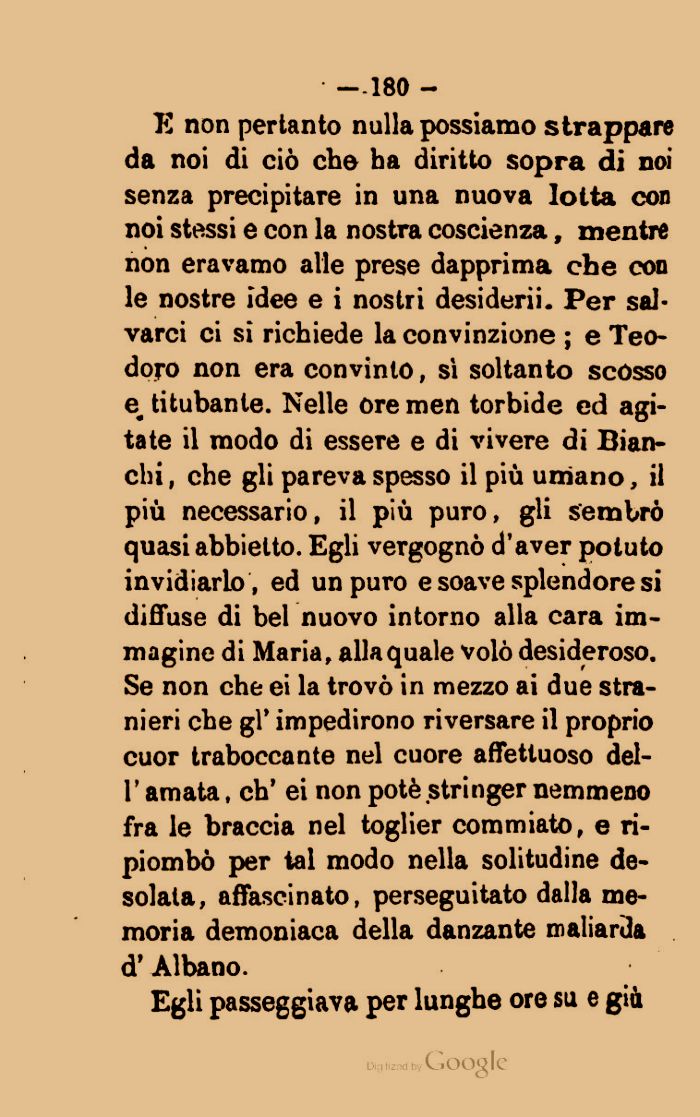 li non pertanto nulla possiamo strappare da noi di ciò che ha diritto sopra di noi senza precipitare in una nuova lotta con noi stessi e con la nostra coscienza, mentre non eravamo alle prese dapprima che con le nostre idee e i nostri desiderii. Per salvarci ci si richiede la convinzione ; e Teodoro non era convinto, si soltanto scosso e_ titubante. Nelle oremen torbide ed agitate il modo di essere e di vivere di Bianchi , che gli pareva spesso il più umano, il più necessario, il più puro, gli sembrò quasi abbietto. Egli vergognò d'aver potuto invidiarlo , ed un puro e soave splendore si diffuse di bel nuovo intorno alla cara immagine di Maria, allaquale volò desideroso. Se non che ei la trovò in mezzo ai due stranieri che gì' impedirono riversare il proprio cuor traboccante nel cuore affettuoso dell'amata , eh' ei non potè stringer nemmeno fra le braccia nel toglier commiato, e ripiombò per tal modo nella solitudine desolata, affascinato, perseguitato dalla memoria demoniaca della danzante maliarda d' Albano.