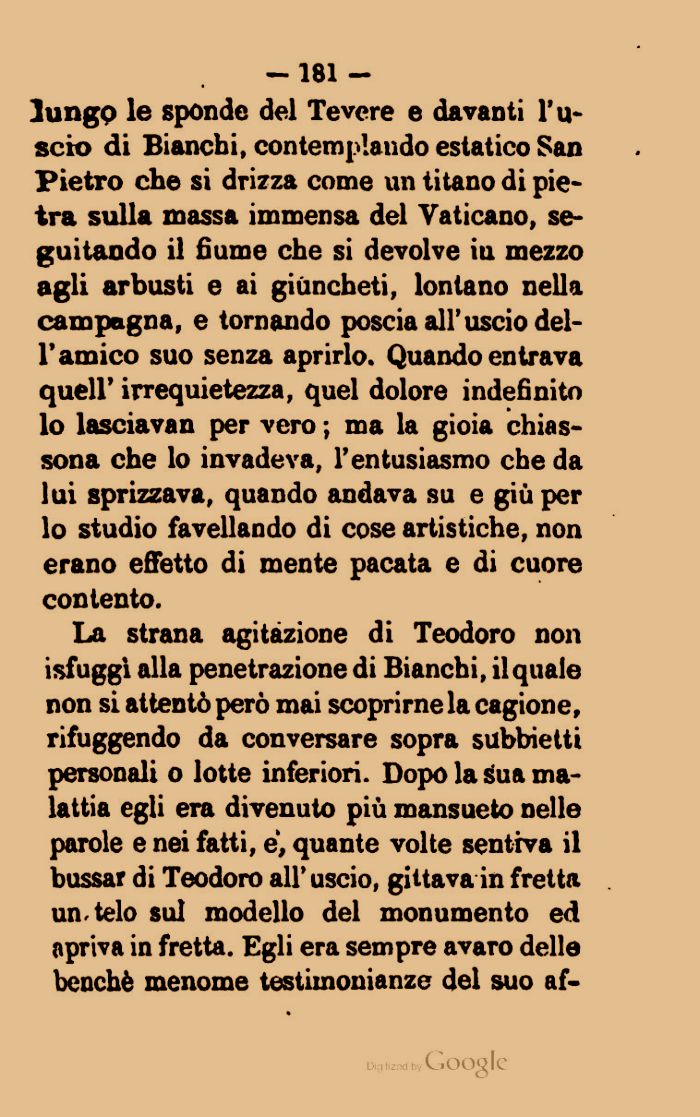 lungo le sponde del Tevere e davanti l'uscio di Bianchi, contemplando estatico San Pietro che si drizza come un titano di pietra sulla massa immensa del Vaticano, seguitando il fiume che si devolve iu mezzo agli arbusti e ai giuncheti, lontano nella campagna, e tornando poscia all'uscio dell'amico suo senza aprirlo. Quando entrava quell' irrequietezza, quel dolore indefinito lo lasciavan per vero ; ma la gioia chias-sona che lo invadeva, l'entusiasmo che da lui sprizzava, quando andava su e giù per lo studio favellando di cose artistiche, non erano effetto di mente pacata e di cuore contento.