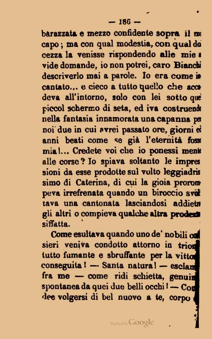 barazzata e mezzo confidente sopra il mi capo ; ma con qual modestia, con qual do cezza la venisse rispondendo alle mie i vide domande, io non potrei, caro Bianchi descriverlo mai a parole. Io era come i» cantato... e cieco a tutto quello che acc* deva all'intorno, solo con lei sotto qiie piccol schermo di seta, ed iva costruenót nella fantasia innamorata una capanna pei noi due in cui avrei passato ore, giorni ei anni beati come se già l'eterniti foss miai... Credete voi che io ponessi menti alle corse ? Io spiava soltanto le impres sioni da esse prodotte sul volto leggiadri simo di Caterina, di cui la gioia proroi» peva irrefrenata quando un biroccio svii tava una cantonata lasciandosi addietn gli altri o compieva qualche altra prodra* siffatta.