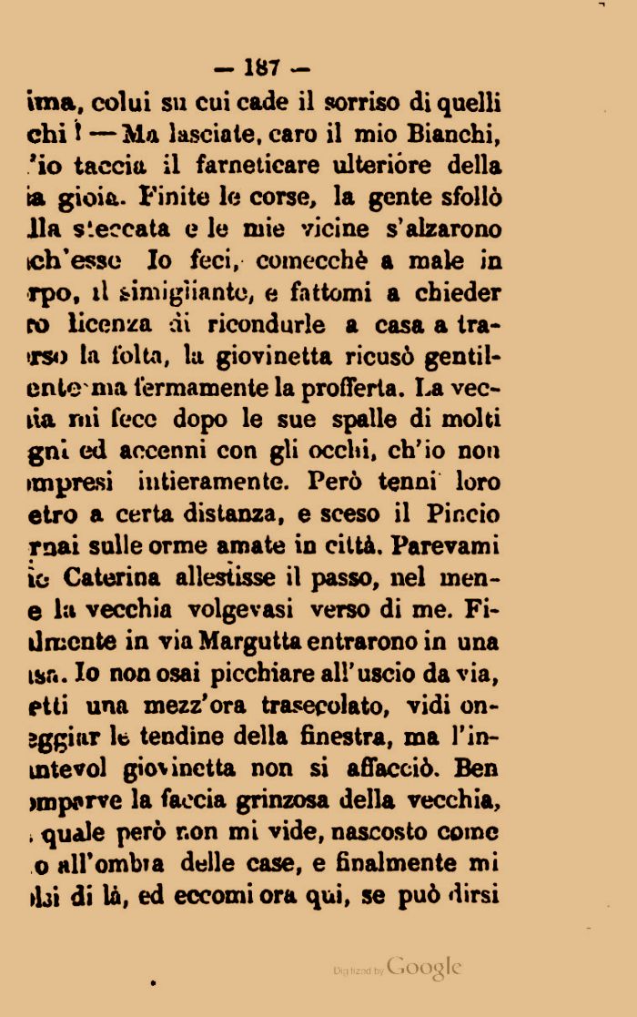 ima, colui su cui cade il sorriso di quelli chi I —Ma lasciale, caro il mio Bianchi, 'io taccia il farneticare ulterióre della la gioia- Finite le corse, la gente sfollò Ila steccata e le mie vicine s'alzarono ich'esso Io feci, comecché a male in rpo, il iiniigìiantc, e fattomi a chieder ro licenza ài ricondurle a casa a tra->rso la folta, la giovinetta ricusò gentil-ente nia fermamente la profferta. La vec-lia mi fece dopo le sue spalle di molti gni ed accenni con gli occhi, ch'io non impresi intieramente. Però tenni loro etro a certa distanza, e sceso il Pir.cio mai sulle orme amate in città. Parevami io Caterina allestisse il passo, nel men-e la vecchia volgevasi verso di me. Fi-ilnucnte in via Margutta entrarono in una tsr>. Io non osai picchiare all'uscio da via, etti una mezz'ora trasecolato, vidi on-ìggiar le tendine della finestra, ma l'in-intevol giovinetta non si affacciò. Ben >mpi