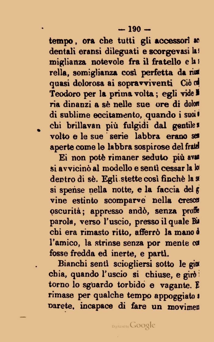 tempo, ora che tutti gli accessori it dentali eransi dileguati e scorgevasi 1»! miglianza notevole fra il fratello e U l rella, somiglianza così perfetta da rio quasi dolorosa ai sopravviventi Ciò d Teodoro per la prima volta ; egli vide I ria dinanzi a sè nelle sue ore di dotai di sublime eccitamento, quando i suoi I chi brillavan più fulgidi dal gentile* volto e le sue serie labbra erano ses aperte come le labbra sospirose del frati!