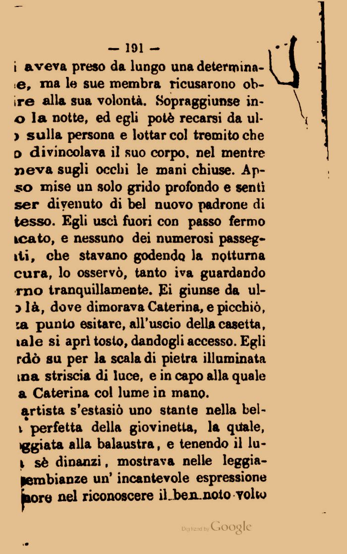 0 la notte, ed egli potè recarsi da ul-j sulla persona e lottar col tremito che d divincolava il suo corpo, nel mentre neva sugli occhi le mani chiuse. Ap-so mise un solo grido profondo e senti ser divenuto di bel nuovo padrone di tesso. Egli usci fuori con passo fermo icato, e nessuno dei numerosi passeggi, che stavano godendo la notturna cura, lo osservò, tanto iva guardando rno tranquillamente. Ei giunse da ul-jlà, dove dimorava Caterina, e picchiò, :a punto esitare, all'uscio della casetta, ¦ale si apri tosto, dandogli accesso. Egli rdò su per la scaladi pietra illuminata ma striscia di luce, e in capo alla quale a Caterina col lume in mano, artista s'estasiò uno stante nella bel-