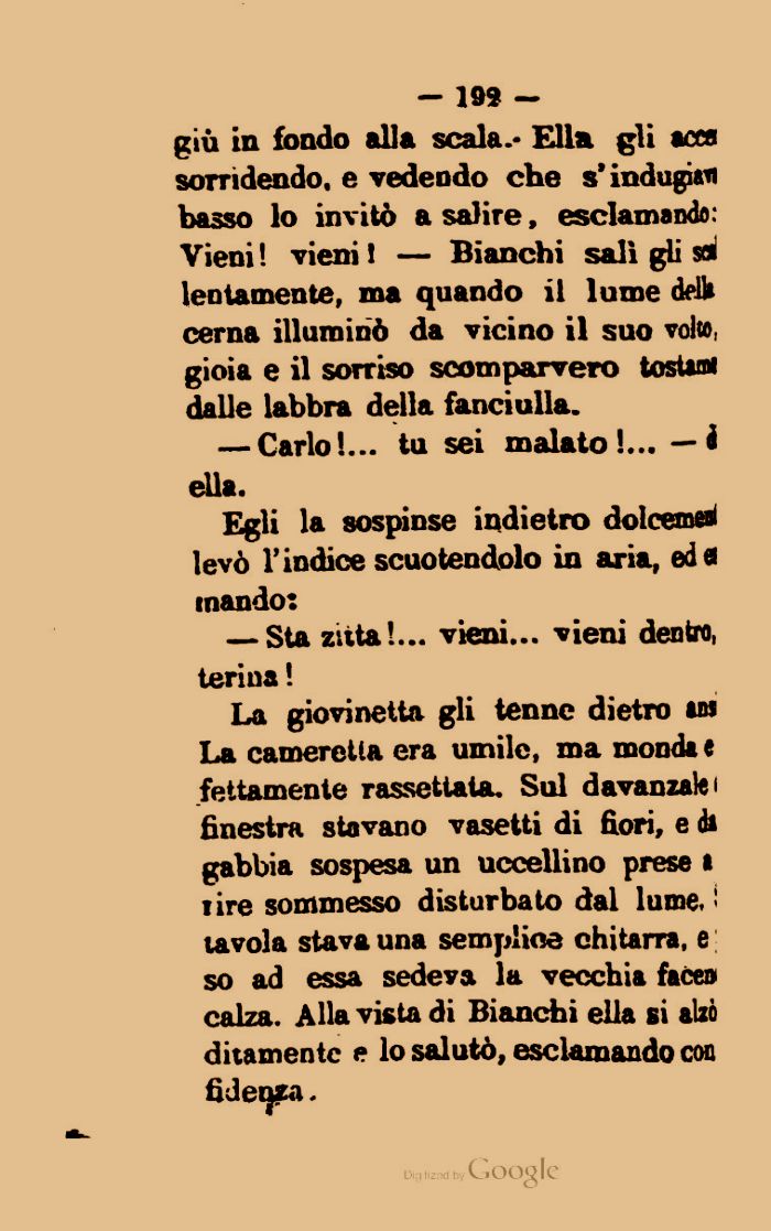 La giovinetta gli tenne dietro ins La cameretta era umile, ma mondi e fattamente rassettata. Sul davanzali finestra stavano vasetti di fiori, e di gabbia sospesa un uccellino prese l lire sommesso disturbato dal lume.: tavola stava una semp'ine chitarra, e so ad essa sedeva la vecchia face» calza. Alla vista di Bianchi ella si allò dilaniente e lo salutò, esclamando con