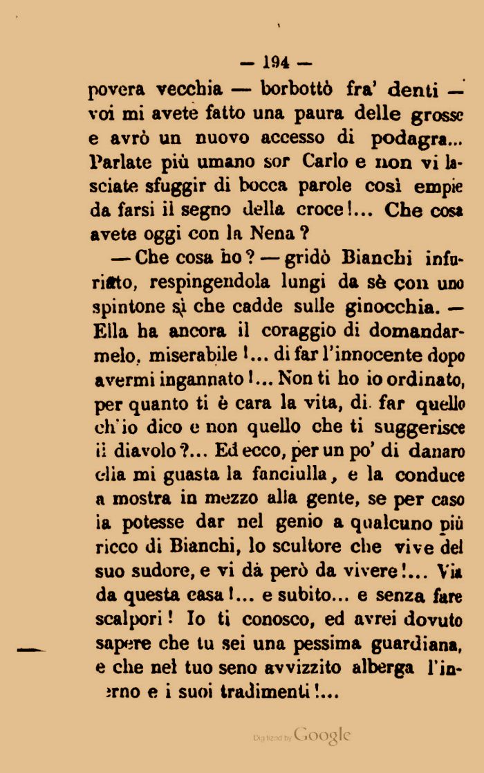 — Che cosa ho ? — gridò Bianchi infuriato, respingendola lungi da sè con uno spintone sì che cadde sulle ginocchia. — Ella ha ancora il coraggio di domandarmelo, miserabile I... di far l'innocente dopo avermi ingannato 1... Non ti ho io ordinato, per quanto ti è cara la vita, di far quelle ch'io dico e non quello che ti suggerisce ii diavolo?... Ed ecco, per un po' di danaro ella mi guasta la fanciulla, e la conduce a mostra in mezzo alla gente, se per caso ia potesse dar nel genio a qualcuno dìù ricco di Bianchi, lo scultore che vive del suo sudore, e vi dà però da vivere !... Vi» da questa casal... e subito... e senza fare scalpori ! Io ti conosco, ed avrei dovuto sapere che tu sei una pessima guardiana, e che nel tuo seno avvizzito alberga l'in-:rno e i suoi tradimenti'....