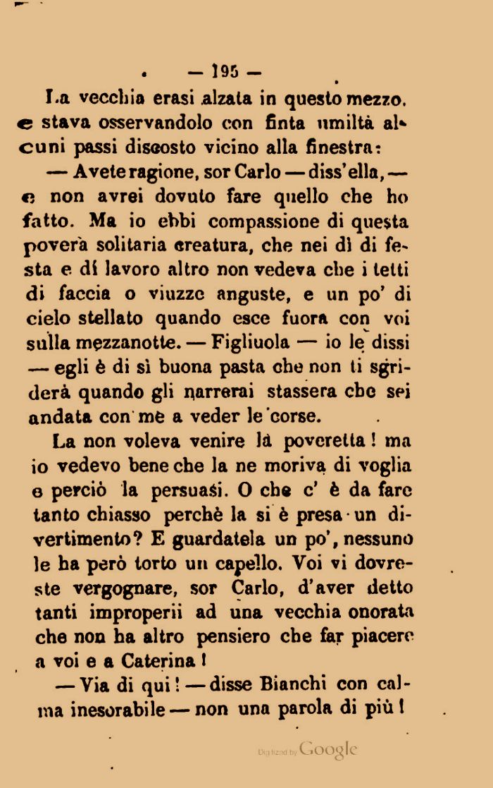 — Avete ragione, sor Carlo — diss'ella, — r, non avrei dovuto fare quello che ho fatto. Ma io ebbi compassione di questa povera solitaria ereatura, che nei di di festa e di lavoro altro non vedeva che i tetti di faccia o viuzze anguste, e un po' di cielo stellato quando esce fuora con voi sulla mezzanotte. — Figliuola — io le dissi — egli è di si buona pasta che non li sgriderà quando gli narrerai stassera che sei andata con m6 a veder le corse.