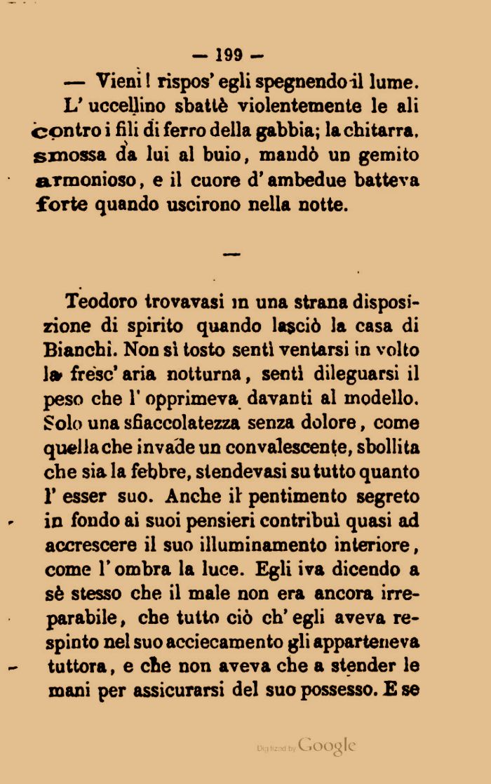 L' uccellino sbattè violentemente le ali contro i fili di ferro della gabbia; la chitarra, smossa da lui al buio, mandò un gemito armonioso, e il cuore d'ambedue batteva forte quando uscirono nella notte.
