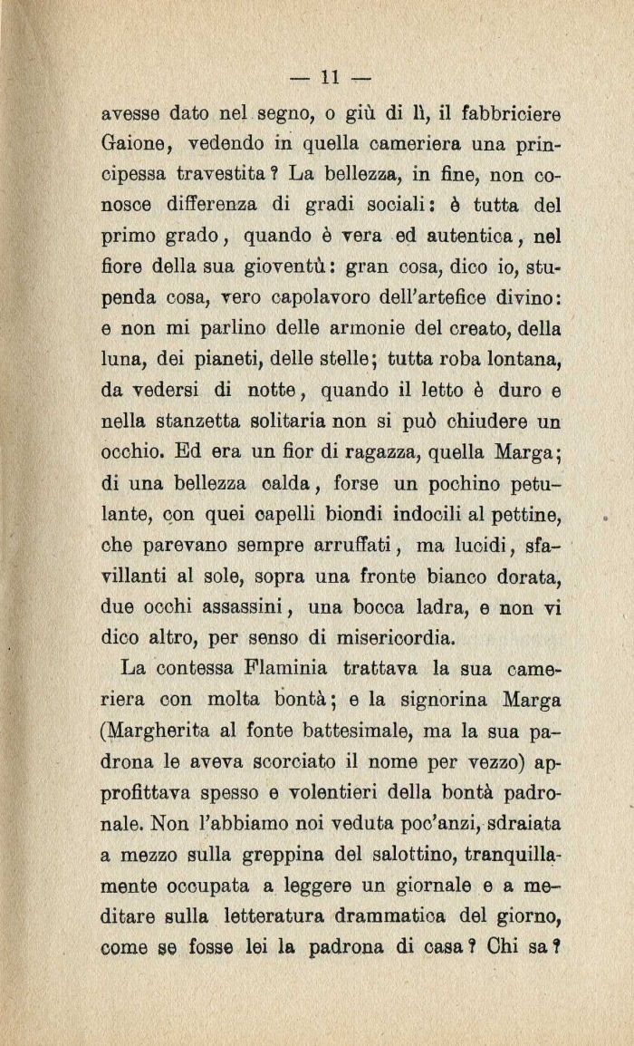 La contessa Flaminia trattava la sua cameriera con molta bontà; e la signorina Marga (Margherita al fonte battesimale| ma la sua padrona le aveva scorciato il nome per vezzo) approfittava spesso e volentieri della bontà padronale. Non l'abbiamo noi veduta poc'anzi| sdraiata a mezzo sulla greppina del salottino| tranquillamente occupata a leggere un giornale e a meditare sulla letteratura drammatica del giorno| come se fosse lei la padrona di casa? Chi sa?