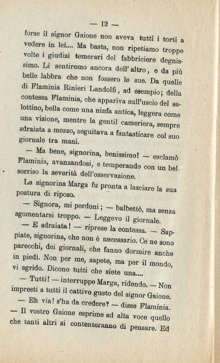forse il signor Gaione non aveva tutti i torti a vedere in lei.... Ma basta| non ripetiamo troppe volte i giudizi temerari del fabbriciero degnissimo. Li sentiremo ancora dell' altro | e da più belle labbra che non fossero le sue. Da quelle di Flaminia Rinieri Landolfi| ad esempio ; della contessa Flaminia| che appariva sull'uscio del sa-lottino| bella come una ninfa antica| leggera come una visione| mentre la gentil cameriera| sempre sdraiata a mezzo| seguitava a fantasticare col suo giornale tra mani.