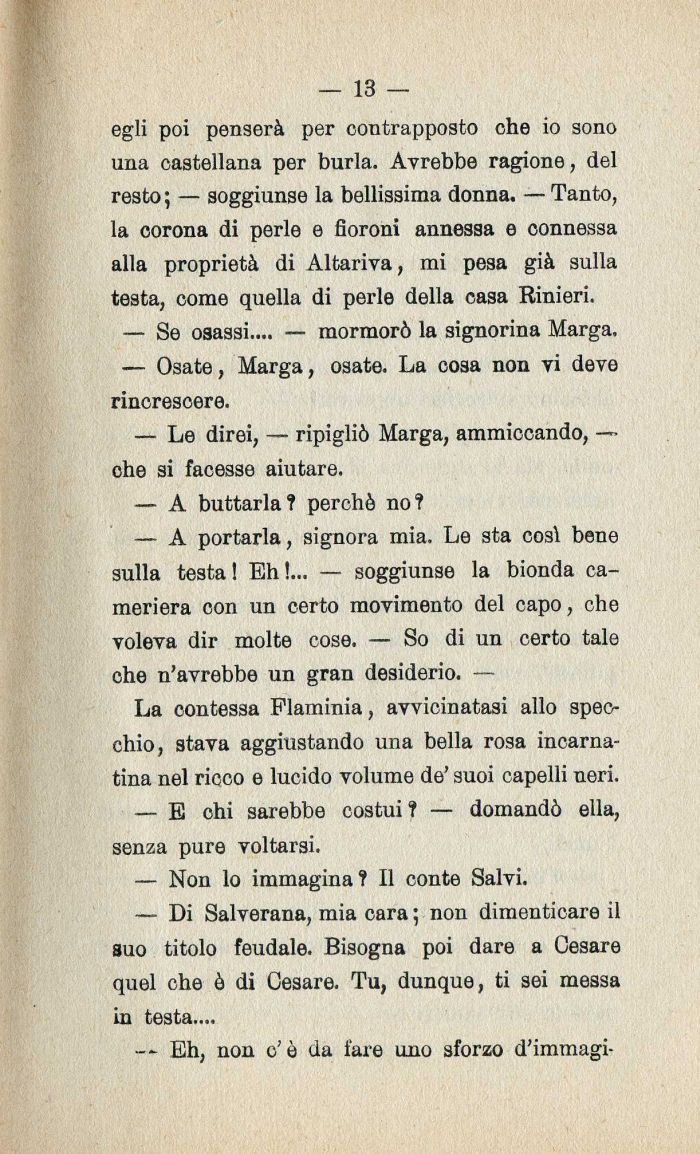 — A portarla| signora mia. Le sta così bene sulla testa! Eh!... — soggiunse la bionda cameriera con un certo movimento del capo| che voleva dir molte cose. — So di un certo tale che n'avrebbe un gran desiderio. —