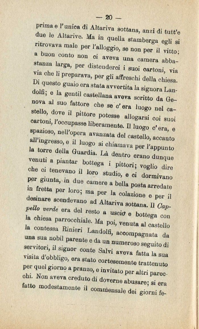 prima e l'unica di Altariva sottana| anzi di tutt'e due le Altarive. Ma in quella stamberga egli si ritrovava male per l'alloggio| se non per il vitto; a buon conto non oi aveva una camera abbastanza larga| per distenderci i suoi oartoni| via via che li preparava| per gli affreschi della chiesa. Di questo guaio era stata avvertita la signora Landolfi; e la gentil castellana aveva scritto da Genova al suo fattore che se o' era luogo nel castello| dove il pittore potesse allogarsi coi suoi oartoni| l'occupasse liberamente. Il luogo c' era| e spazioso| nell'opera avanzata del castello| accanto all'ingresso| e il luogo si chiamava per l'appunto la torre della Guardia. Là dentro erano dunque venuti a piantar bottega i pittori; voglio dire che oi tenevano il loro studio| e oi dormivano per giunta| in due camere a bella posta arredate in fretta per loro; ma per la colazione e per il desinare scendevano ad Altariva sottana. Il Cappello verde era del resto a uscicf e bottega con la chiesa parrocchiale. Ma poi| venuta al castello la contessa Rinieri Landolfi| acoompagnata da una sua nobil parente e da un numeroso seguito di servitori| il signor conte Salvi aveva fatta la sua visita d'obbligo| era stato cortesemente trattenuto per quel giorno a pranzo| e invitato per altri parecchi. Non aveva creduto di doverne abusare; si era fatto modestamente il commensale dei giorni fe-