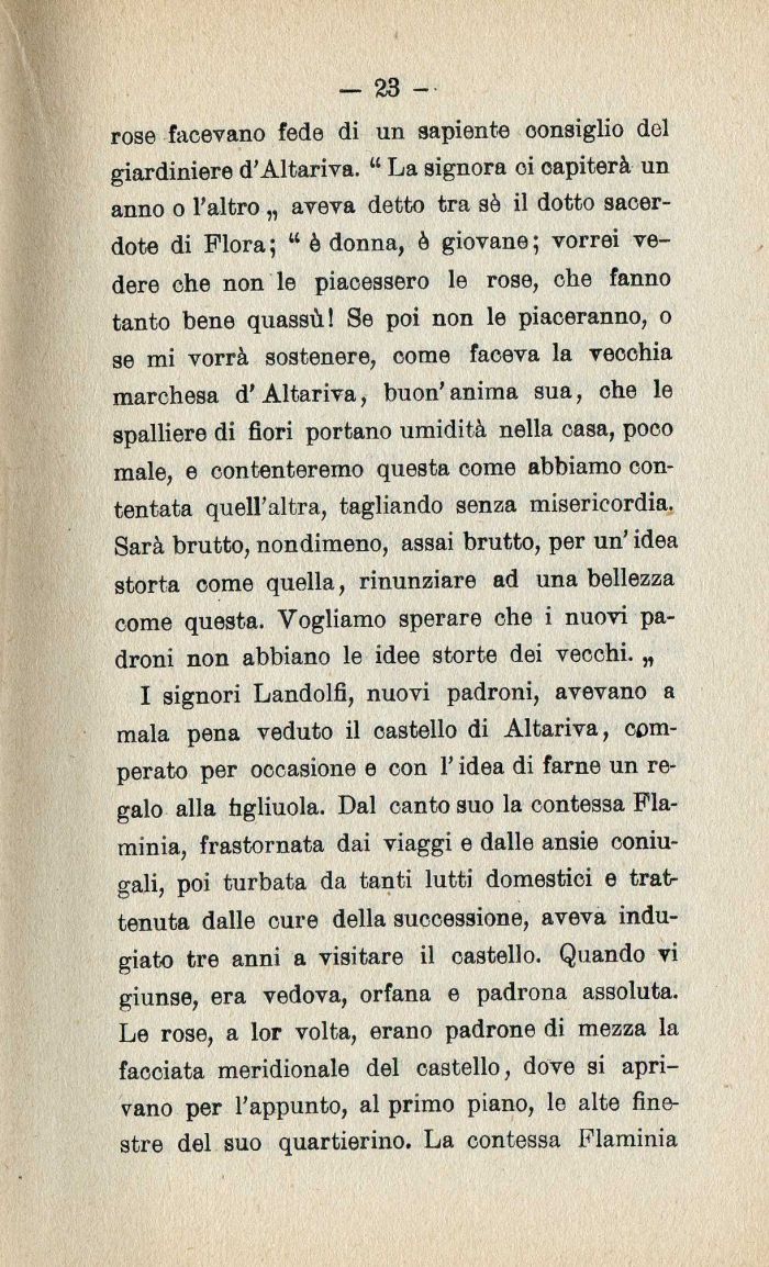 I signori Landolfi| nuovi padroni| avevano a mala pena veduto il castello di Altariva| comperato per occasione e con l'idea di farne un regalo alla figliuola. Dal canto suo la contessa Flaminia| frastornata dai viaggi e dalle ansie coniugali| poi turbata da tanti lutti domestici e trattenuta dalle cure della successione| aveva indugiato tre anni a visitare il castello. Quando vi giunse| era vedova| orfana e padrona assoluta. Le rose| a lor volta| erano padrone di mezza la facciata meridionale del castello| dove si aprivano per l'appunto| al primo piano| le alte finestre del suo quartierino. La contessa Flaminia