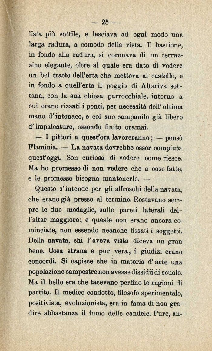 Questo s'intende per gli affreschi della navata| che erano già presso al termine. Restavano sempre le due medaglie| sulle pareti laterali dell'aitar maggiore; e queste non erano ancora cominciate| non essendo neanche fissati i soggetti. Della navata| ohi l'aveva vista diceva un gran bene. Cosa strana e pur vera| i giudizi erano conoordi. Si oapisce ohe in materia d'arte una popolazione campestre non avesse dissidii di scuole. Ma il bello era che tacevano perfino le ragioni di partito. Il medico condotto| filosofo sperimentale| positivista| evoluzionista| era in fama di non gradire abbastanza il fumo delle candele. Pure| an-