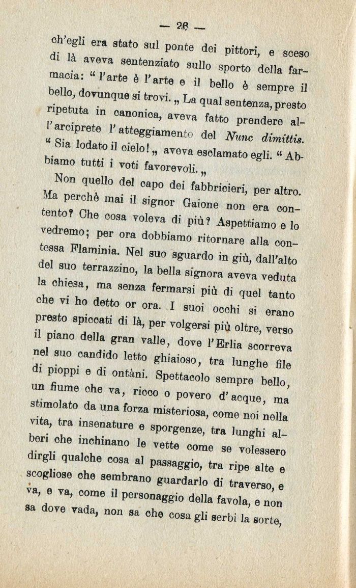ch'egli era stato sul ponte dei pittori| e sceso di là aveva sentenziato sullo sporto della farmacia: 'l'arte è l'arte e il bello è sempre il bello| dovunque si trovi. „ La qual sentenza| presto ripetuta in canonica| aveva fatto prendere all' arciprete l'atteggiamento del Nunc dimittis. ' Sia lodato il cielo ! „ aveva esclamato egli. ' Abbiamo tutti i voti favorevoli. „