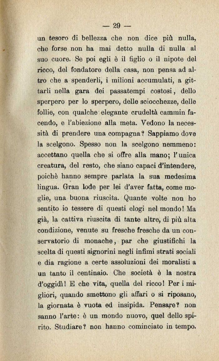 un tesoro di bellezza che non dice più nulla| che forse non ha mai detto nulla di nulla al suo cuore. Se poi egli è il figlio o il nipote del ricco| del fondatore della casa| non pensa ad altro che a spenderli| i milioni accumulati| a git-tarli nella gara dei passatempi costosi| dello sperpero per lo sperpero| delle soiocohezze| delle follie| con qualche elegante crudeltà cammin facendo| e l'abiezione alla meta. Vedono la necessità di prendere una compagna ? Sappiamo dove la scelgono. Spesso non la scelgono nemmeno: accettano quella che si offre alla mano; l'unica creatura| del resto| che siano capaci d'intendere| poiché hanno sempre parlata la sua medesima lingua. Gran lode per lei d'aver fatta| come moglie| una buona riuscita. Quante volte non ho sentito io tessere di questi elogi nel mondo ! Ma già| la cattiva riuscita di tante altre| di più alta condizione| venute su fresche fresche da un conservatorio di monaohe| par che giustifichi la scelta di questi signorini negli infimi strati sociali e dia ragione a certe assoluzioni dei moralisti a un tanto il centinaio. Che società è la nostra d'oggidì ! E che vita| quella del ricco ! Per i migliori| quando smettono gli affari o si riposano| la giornata è vuota ed insipida. Pensare? non sanno l'arte : è un mondo nuovo| quel dello spirito. Studiare? non hanno cominciato in tempo.