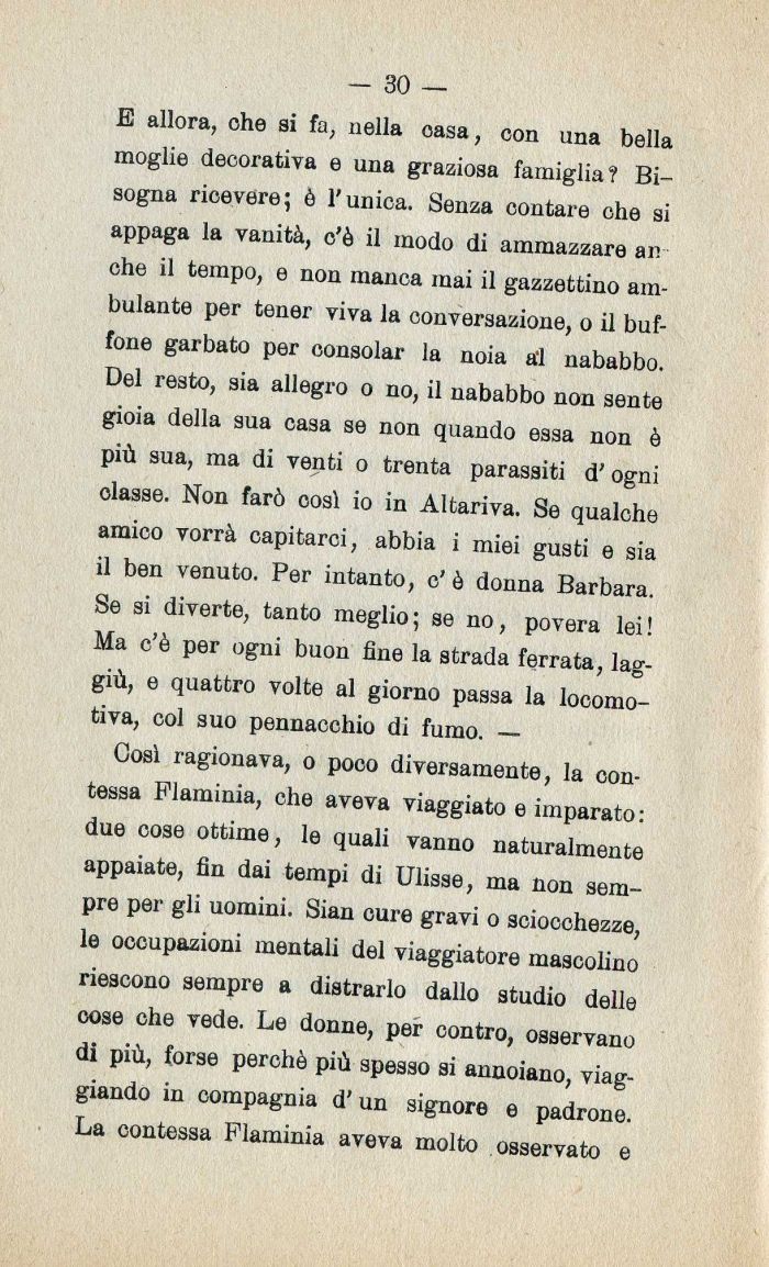 Così ragionava| o poco diversamente| la contessa Flaminia| che aveva viaggiato e imparato: due cose ottime| le quali vanno naturalmente appaiate| fin dai tempi di Ulisse| ma non sempre per gli uomini. Sian cure gravi o sciocchezze| le occupazioni mentali del viaggiatore mascolino riescono sempre a distrarlo dallo studio delle oose che vede. Le donne| per contro| osservano di più| forse perchè più spesso si annoiano| viaggiando in compagnia d'un signore e padrone. La contessa Flaminia aveva molto osservato e