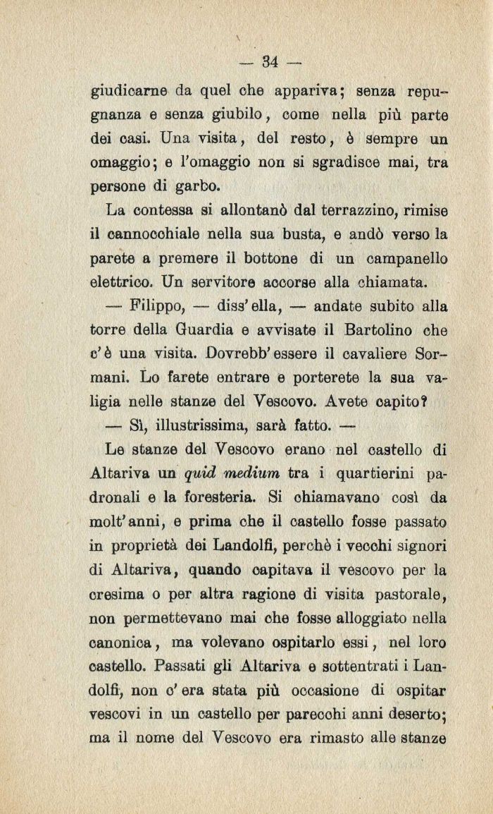 Le stanze del Vescovo erano nel castello di Altariva un quid medium tra i quartierini padronali e la foresteria. Si chiamavano così da molt'anni| e prima che il castello fosse passato in proprietà dei Landolfi| perchè i vecchi signori di Altariva| quando oapitava il vescovo per la cresima o per altra ragione di visita pastorale| non permettevano mai che fosse alloggiato nella canonica| ma volevano ospitarlo essi| nel loro castello. Passati gli Altariva e sottentrati i Landolfi| non o' era stata più occasione di ospitar vescovi in un castello per parecohi anni deserto; ma il nome del Vescovo era rimasto alle stanze
