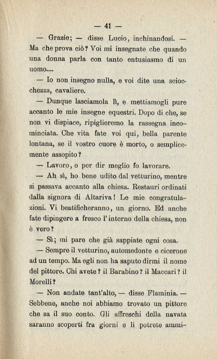 — Non andate tant'alto| — disse Flaminia. — Sebbene| anche noi abbiamo trovato un pittore che sa il suo conto. Gli affreschi della navata saranno scoperti fra giorni e li potrete ammi-