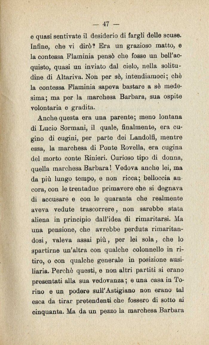 Anche questa era una parente; meno lontana di Lucio Sormani| il quale| finalmente| era cugino di cugini| per parte dei Landolfi| mentre essa| la marchesa di Ponte Rovella| era cugina del morto conte Rinieri. Curioso tipo di donna| quella marchesa Barbara ! Vedova anche lei| ma da più lungo tempo| e non ricca; belloccia an cora| con le trentadue primavere ohe si degnava di accusare e con le quaranta che realmente aveva vedute trascorrere| non sarebbe stata aliena in principio dall'idea di rimaritarsi. Ma una pensione| che avrebbe perduta rimaritandosi | valeva assai più| per lei sola| che lo spartirne un'altra con qualche colonnello in ritiro| o con qualche generale in posizione ausiliaria. Perchè questi| e non altri partiti si erano presentati alla sua vedovanza ; e una casa in Torino e un podere sull'Astigiano non erano tal esca da tirar pretendenti ohe fossero di sotto ai cinquanta. Ma da un pezzo la marohesa Barbara