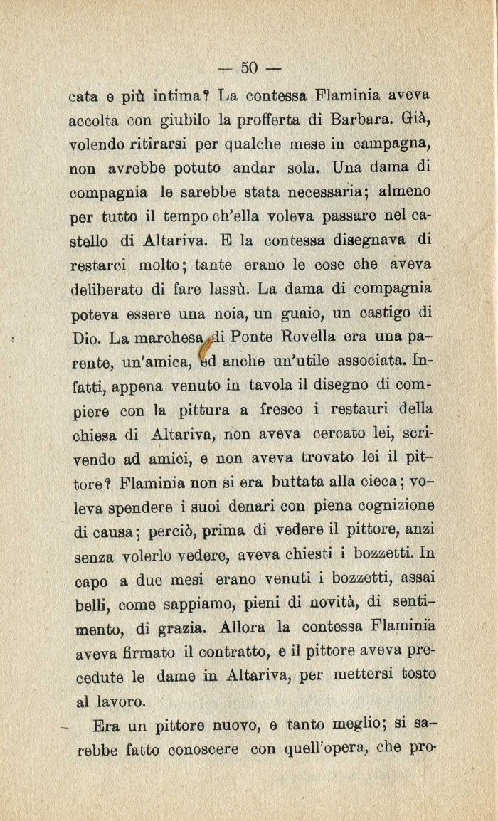 cata e più intima? La contessa Flaminia aveva accolta con giubilo la profferta di Barbara. Già| volendo ritirarsi per qualche mese in campagna| non avrebbe potuto andar sola. Una dama di compagnia le sarebbe stata necessaria; almeno per tutto il tempo ch'ella voleva passare nel castello di Altariva. E la contessa disegnava di restarci molto; tante erano le cose che aveva deliberato di fare lassù. La dama di compagnia poteva essere una noia| un guaio| un castigo di Dio. La marchesa|di Ponte Rovella era una parente| un'amica| ed anche un'utile associata. Infatti| appena venuto in tavola il disegno di compiere con la pittura a fresco i restauri della chiesa di Altariva| non aveva cercato lei| scrivendo ad amici| e non aveva trovato lei il pittore ? Flaminia non si era buttata alla cieca ; voleva spendere i suoi denari con piena cognizione di causa; perciò| prima di vedere il pittore| anzi senza volerlo vedere| aveva chiesti i bozzetti. In capo a due mesi erano venuti i bozzetti| assai belli| come sappiamo| pieni di novità| di sentimento| di grazia. Allora la contessa Flaminia aveva firmato il contratto| e il pittore aveva precedute le dame in Altariva| per mettersi tosto al lavoro.