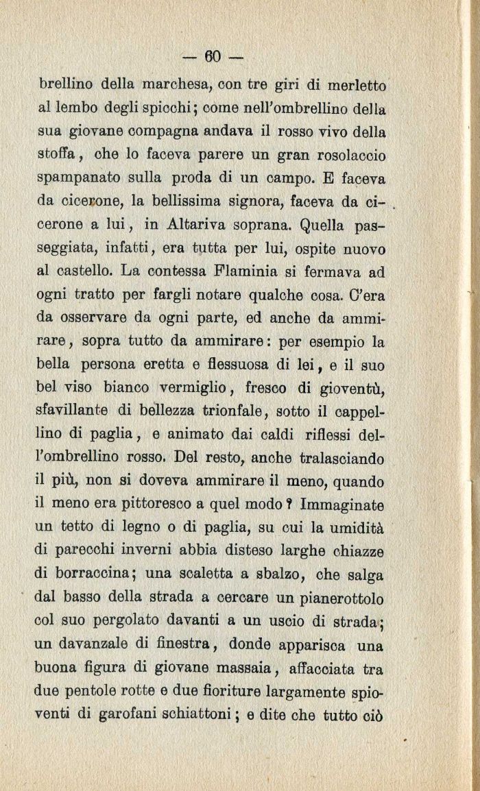brellino della marchesa| con tre giri di merletto al lembo degli spicchi; come nell'ombrellino della sua giovane compagna andava il rosso vivo della stoffa| ohe lo faceva parere un gran rosolaccio spampanato sulla proda di un campo. B faceva da cicerone| la bellissima signora| faceva da cicerone a lui| in Altariva soprana. Quella passeggiata| infatti| era tutta per lui| ospite nuovo al castello. La contessa Flaminia si fermava ad ogni tratto per fargli notare qualche cosa. C'era da osservare da ogni parte| ed anche da ammirare| sopra tutto da ammirare: per esempio la bella persona eretta e flessuosa di lei| e il suo bel viso bianco vermiglio| fresco di gioventù| sfavillante di bellezza trionfale| sotto il cappellino di paglia| e animato dai caldi riflessi dell'ombrellino rosso. Del resto| anche tralasciando il più| non si doveva ammirare il meno| quando il meno era pittoresco a quel modo ? Immaginate un tetto di legno o di paglia| su cui la umidità di parecchi inverni abbia disteso larghe chiazze di borraccina; una scaletta a sbalzo| che salga dal basso della strada a cercare un pianerottolo col suo pergolato davanti a un uscio di strada; un davanzale di finestra| donde apparisca una buona figura di giovane massaia| affacciata tra due pentole rotte e due fioriture largamente spioventi di garofani schiattoni ; e dite che tutto oiò