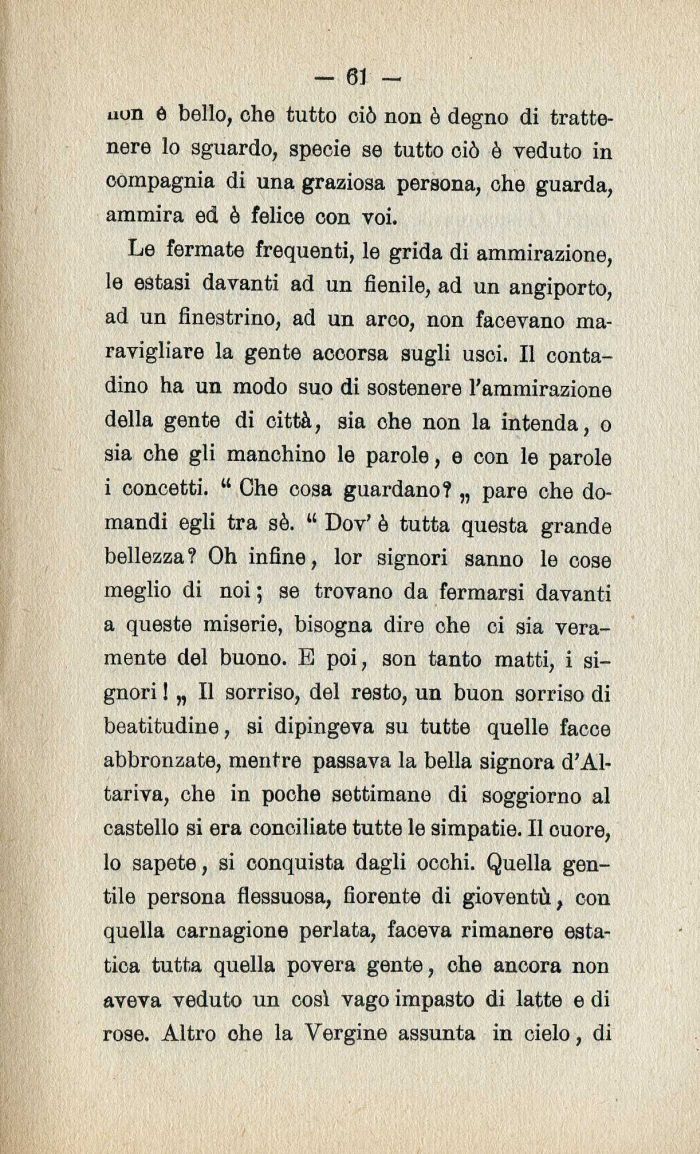 Le fermate frequenti| le grida di ammirazione| le estasi davanti ad un fienile| ad un angiporto| ad un finestrino| ad un arco| non facevano maravigliare la gente accorsa sugli usci. Il contadino ha un modo suo di sostenere l'ammirazione della gente di città| sia che non la intenda| o sia che gli manchino le parole| e con le parole i concetti. ' Che cosa guardano? „ pare che domandi egli tra sò. ' Dov' è tutta questa grande bellezza? Oh infine| lor signori sanno le cose meglio di noi ; se trovano da fermarsi davanti a queste miserie| bisogna dire che ci sia veramente del buono. E poi| son tanto matti| i signori 1 „ Il sorriso| del resto| un buon sorriso di beatitudine| si dipingeva su tutte quelle facce abbronzate| mentre passava la bella signora d'Al-tariva| che in poche settimane di soggiorno al castello si era conciliate tutte le simpatie. Il cuore| lo sapete| si conquista dagli occhi. Quella gentile persona flessuosa| fiorente di gioventù| cou quella carnagione periata| faceva rimanere estatica tutta quella povera gente| che ancora non aveva veduto un cosi vago impasto di latte e di rose. Altro ohe la Vergine assunta in cielo| di