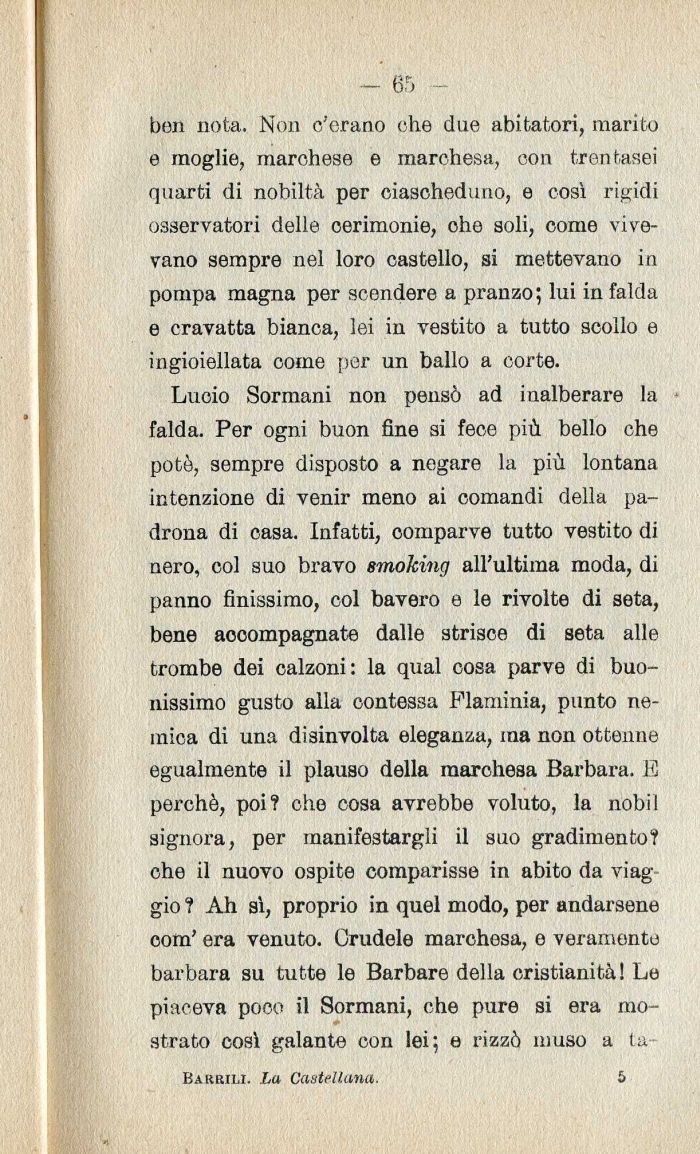 Lucio Sormani non pensò ad inalberare la falda. Per ogni buon fine si fece più bello che potò| sempre disposto a negare la più lontana intenzione di venir meno ai comandi della padrona di casa. Infatti| oomparve tutto vestito di nero| col suo bravo smoking all'ultima moda| di panno finissimo| col bavero e le rivolte di 3eta| bene aocompagnate dalle strisce di seta alle trombe dei calzoni: la qual cosa parve di buonissimo gusto alla contessa Flaminia| punto nemica di una disinvolta eleganza| ma non ottenne egualmente il plauso della marchesa Barbara. E perchè| poi? che cosa avrebbe voluto| la nobil signora| per manifestargli il suo gradimento? ohe il nuovo ospite comparisse in abito da viaggio ? Ah sì| proprio in quel modo| per andarsene com' era venuto. Crudele marchesa| e veramente barbara su tutte le Barbare della cristianità! Le piaceva poco il Sormani| che pure si era mostrato così galante con lei; e rizzò muso a tu Barrili. La Castellana. 5