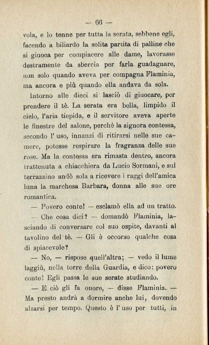 vola| e lo tenne per tutta la serata| sebbene egli| facendo a biliardo la solita partita di palline che si giuoca per compiacere alle dame| lavorasse destramente da sbercia per farla guadagnare| non solo quando aveva per compagna Flaminia| ma ancora e più quando ella andava da sola.