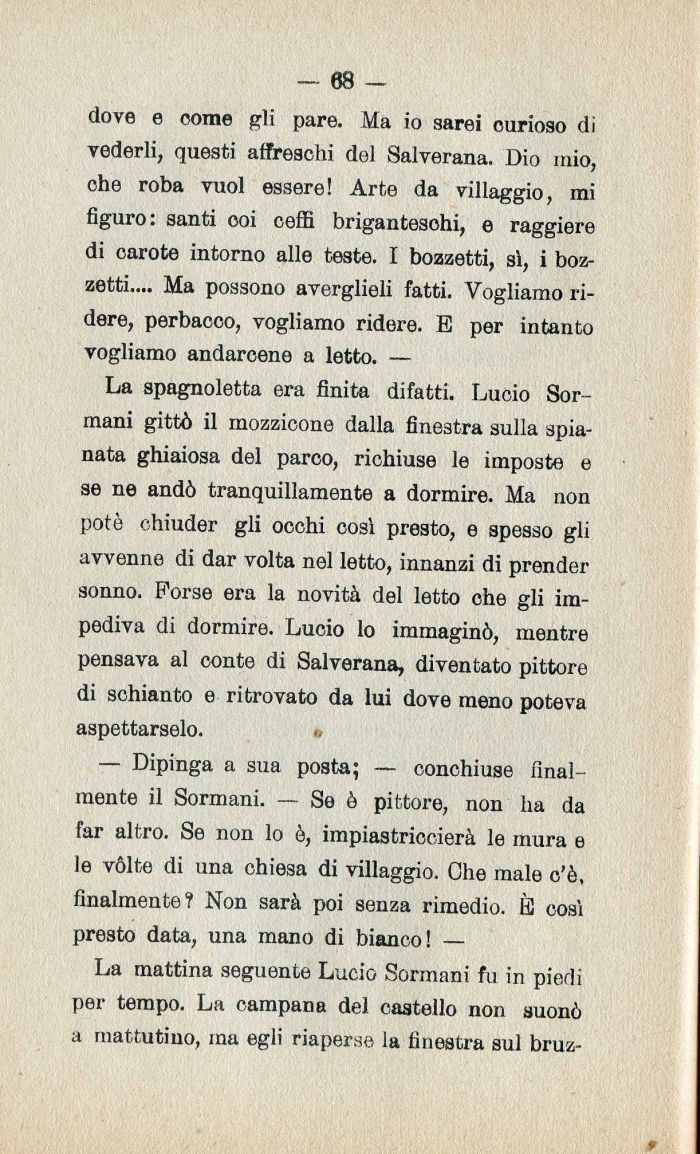 La spagnoletta era finita difatti. Lucio Sor-mani gittò il mozzicone dalla finestra sulla spianata ghiaiosa del parco| richiuse le imposte e se ne andò tranquillamente a dormire. Ma non potè chiuder gli occhi cosi presto| e spesso gli avvenne di dar volta nel letto| innanzi di prender sonno. B'orse era la novità del letto che gli impediva di dormire. Lucio lo immaginò| mentre pensava al conte di Salverana| diventato pittore di schianto e ritrovato da lui dove meno poteva aspettarselo.