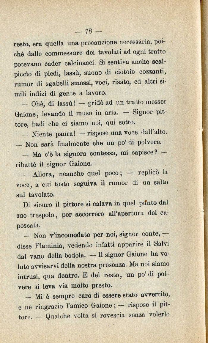 — Non v'incomodate per noi| signor conte| — disse Flaminia| vedendo infatti apparire il Salvi dal vano della bodola. — Il signor Gaione ha voluto avvisarvi della nostra presenza. Ma noi siamo intrusi| qua dentro. E del resto| un po'di polvere si leva via molto presto.