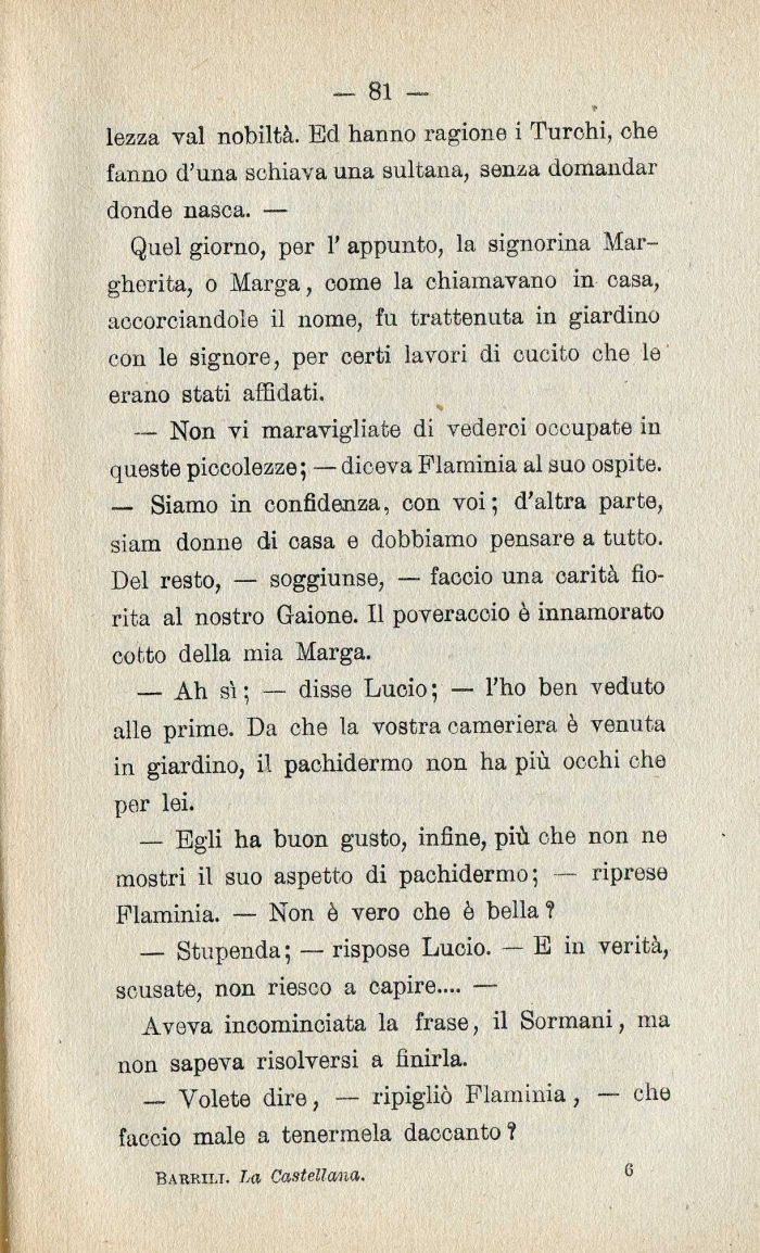 — Non vi maravigliate di vederci occupate in queste piccolezze; — diceva Flaminia al suo ospite. — Siamo in confidenza| con voi; d'altra parte| siam donne di casa e dobbiamo pensare a tutto. Del resto| — soggiunse| — faccio una carità fiorita al nostro Gaione. Il poveraccio ò innamorato cotto della mia Marga.