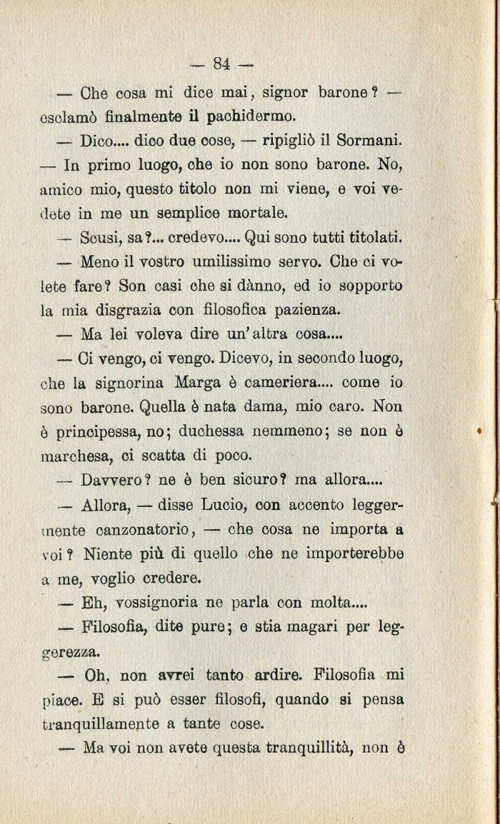 — Ci vengo| ci vengo. Dicevo| in secondo luogo| che la signorina Marga è cameriera.... come io sono barone. Quella è nata dama| mio caro. Non ò principessa| no ; duchessa nemmeno ; se non ò marchesa| ci scatta di poco.